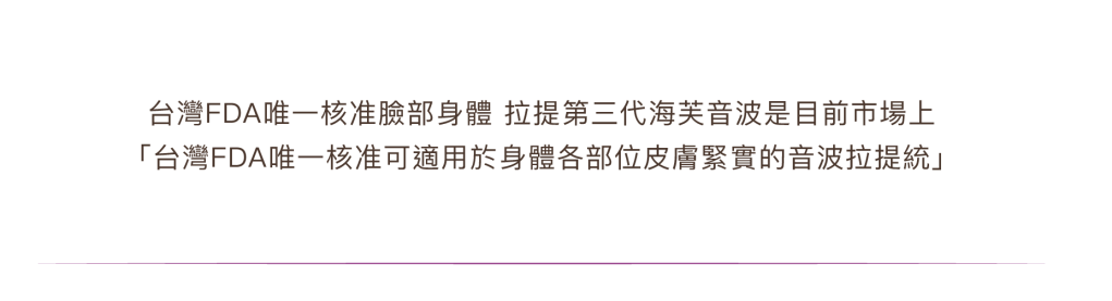 通過衛福部TFDA醫療器材許可證(衛部醫器輸字第 030694 號),是利用高能聚焦超音波的能量作用在肌膚的不同的深淺度,進行拉提及緊緻,可使用在臉部及身體的音波拉提儀器。非侵入式的療程設計,透過聚焦式超音波將能量作用(65~75°C)在不同的皮膚層,涵蓋表皮層、真皮層及SMAS層,達到拉提的效果。
