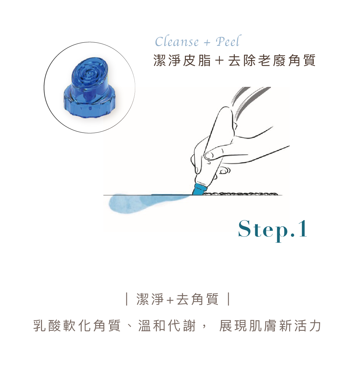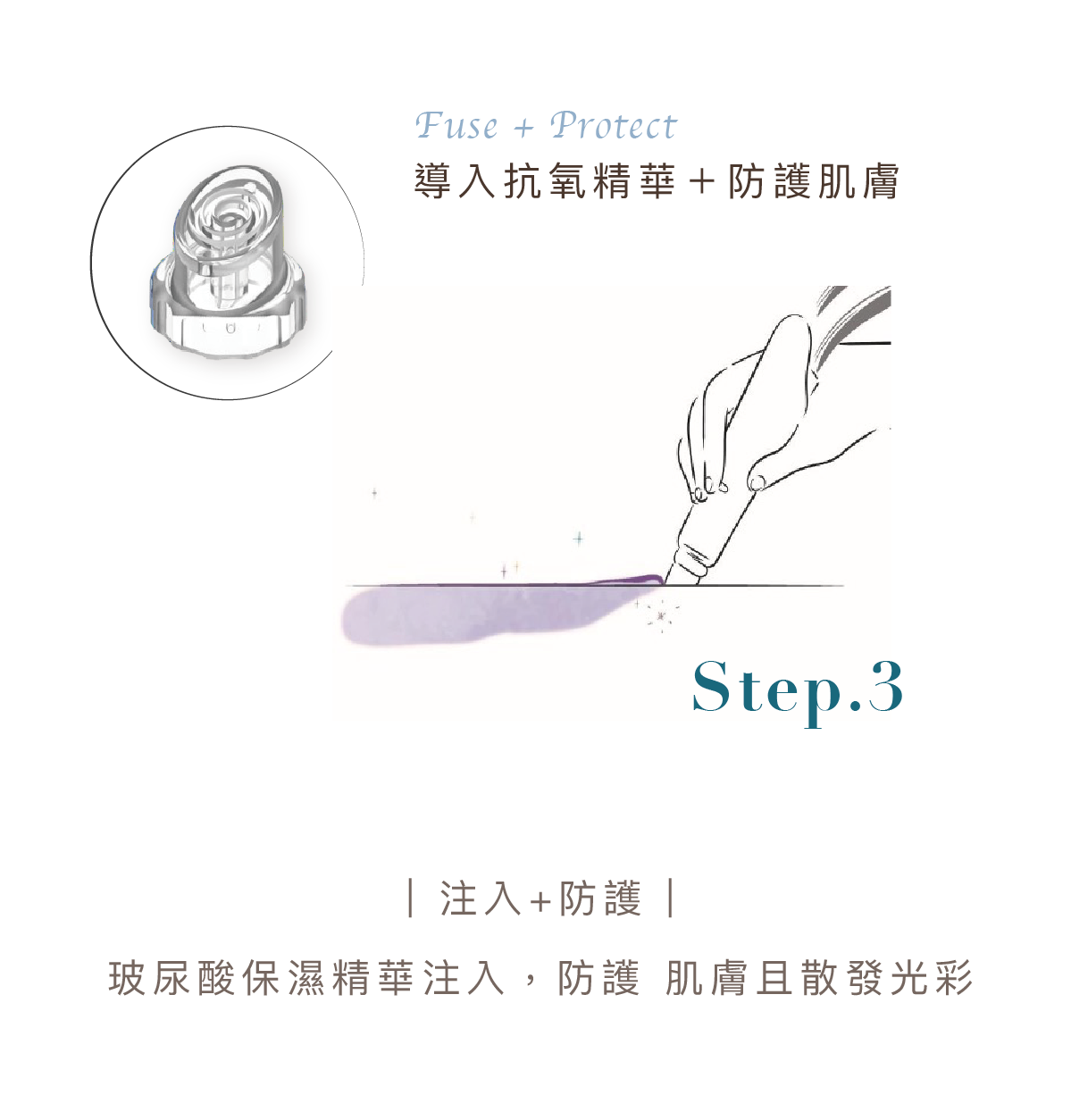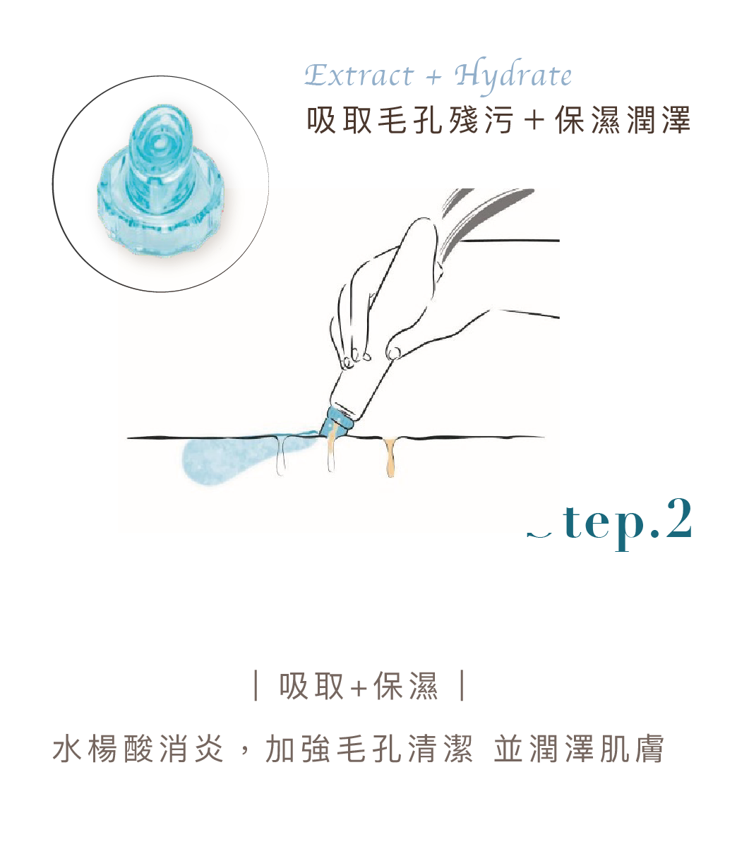 端頭的螺旋刮片設計搭配負壓技術,使精華液注入過程中產生渦漩效果,讓髒污在脫落的同時,給予肌膚滋潤與抗氧化防護。